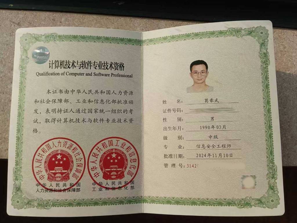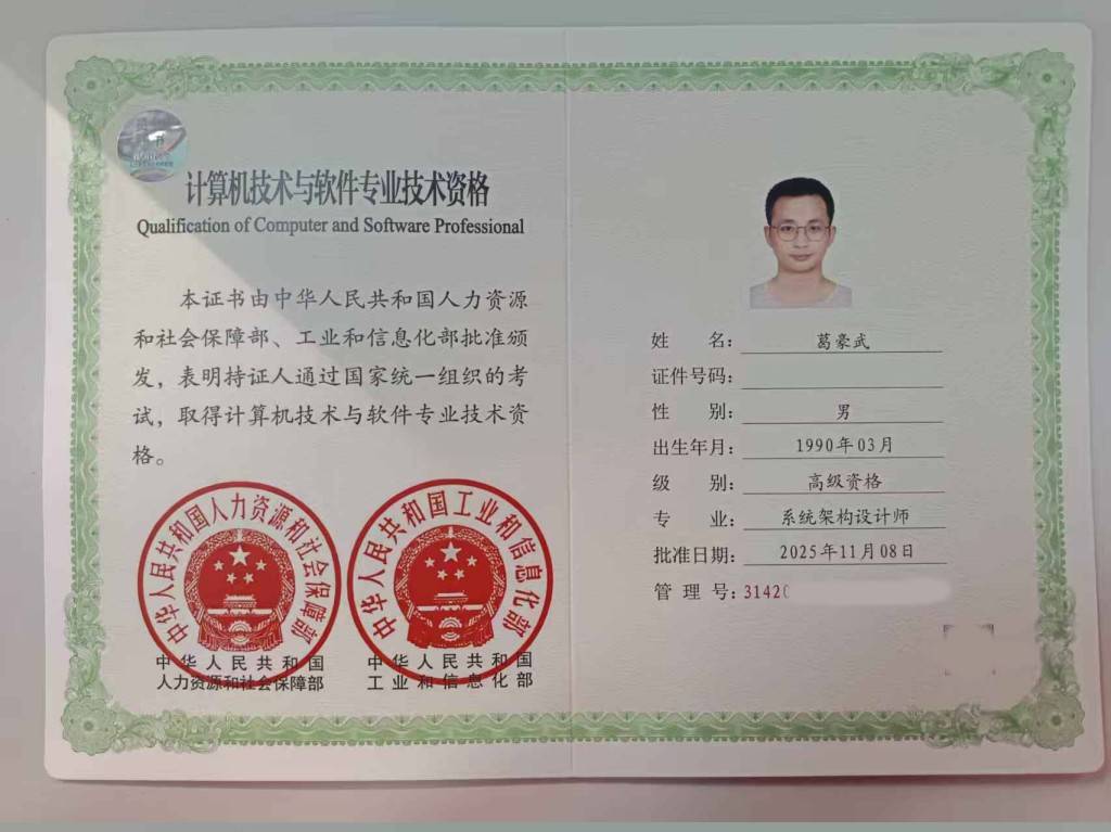 Through continuous learning and practice, I obtained the Intermediate Professional Title of Information Security Engineer in 2024, followed by the Senior Professional Title of System Architect Designer in 2025.